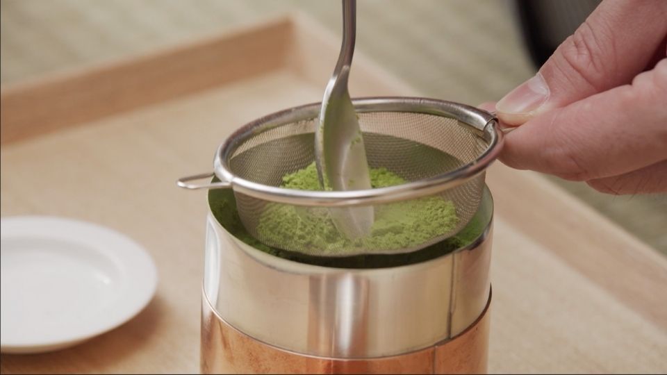 Begin by sifting matcha—always sift the matcha for the best texture and taste.