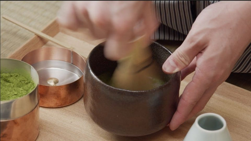 Remove whisk from warm water. Shake off excess. Hovering just above the bottom of matcha bowl, whip vigorously with the wrist, using a back-and-forth motion in the shape on the letter M until the tea is sufficiently aerated and a fine, creamy foam forms on the surface, approximately 15-25 seconds. Use whisk to remove larger bubbles and to smooth out surface.