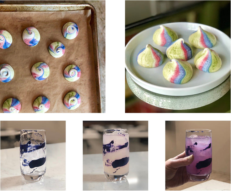 A little water and a touch of glycerin added to a tea/botanical powder will produce a thick, paintable consistency – perfect for application inside a serving glass or pastry bag (think meringue or frosting.)