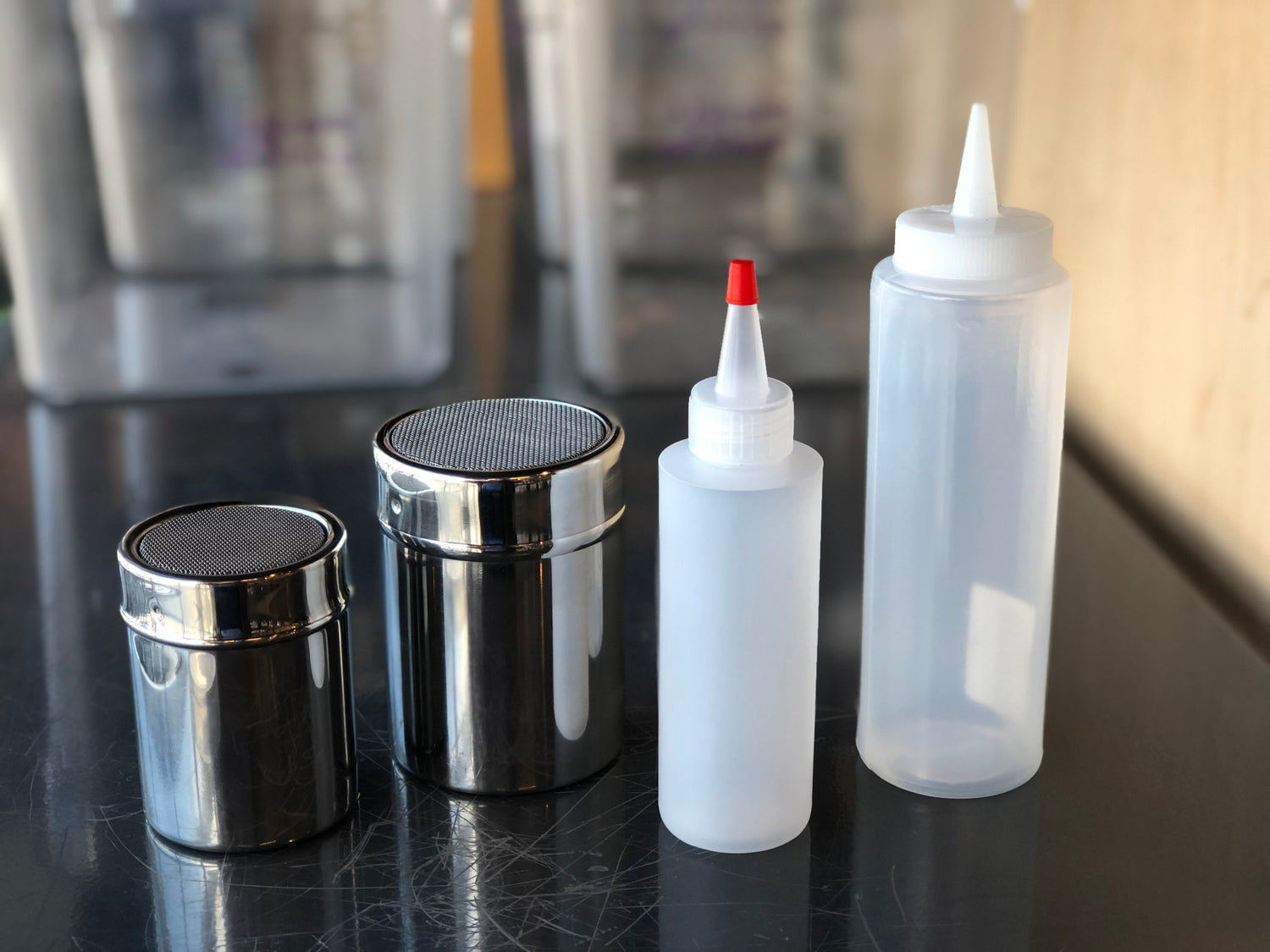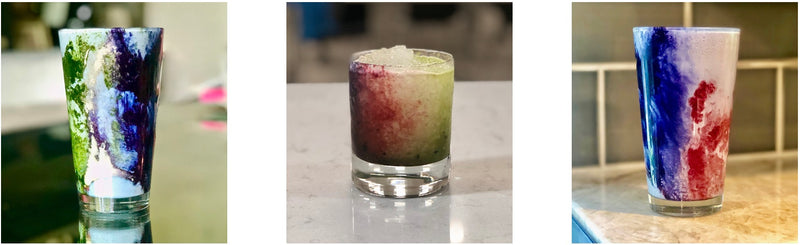 Coat the inside of a serving glass with water, juice, or simple syrup. Then unleash your inner “Jackson Pollock” by applying a thin layer of powder. Top with a blended creation of choice (neutral colors work best.)