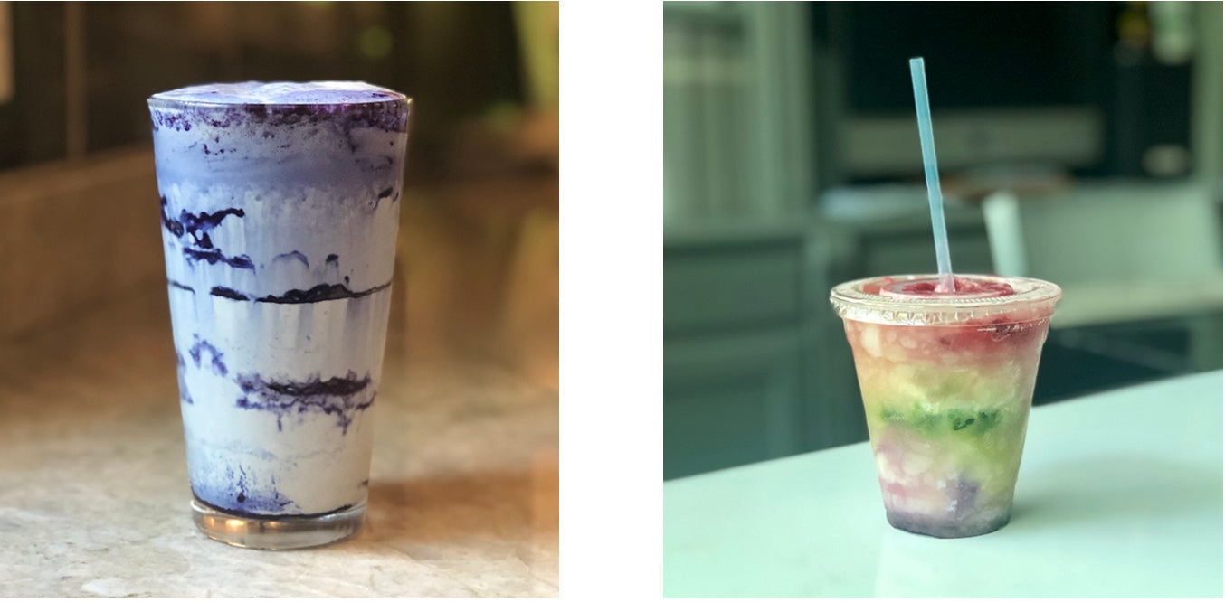 This approach is ideal when serving up beverages with thicker consistencies such as milkshakes, frappés, or smoothies. No two creations will be exactly the same and the appearance will continually evolve as the colors spread & incorporate as the drink is enjoyed.