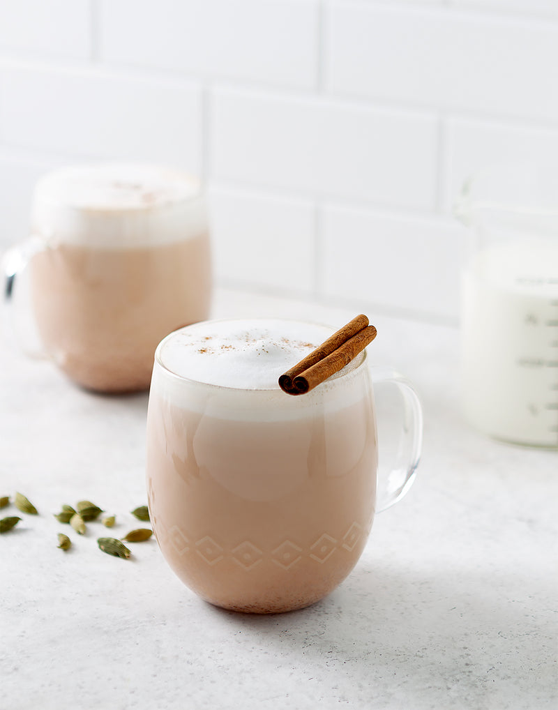 - Electric Whisk: gently heat your milk and chai on the stove to desired temperature. Add mixture to a jar or vessel and create froth with the electric whisk. Pour into your favorite, pre-heated mug and enjoy!