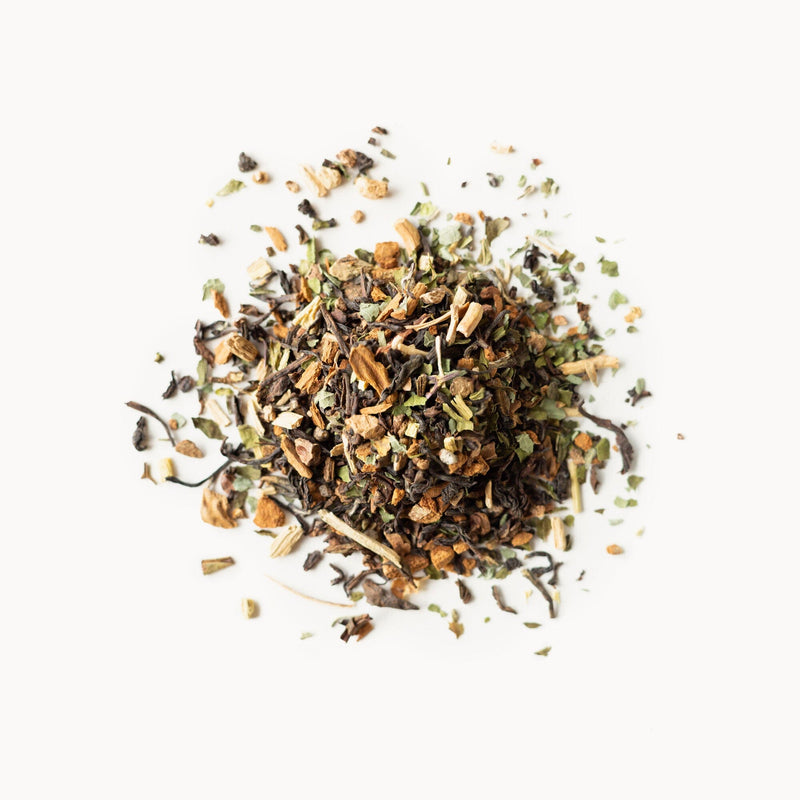 In our Tulsi Chai, invigorating black Darjeeling tea offers a strong base to this tea botanical blend. The addition of Tulsi– renowned for its calming effect and support in cognitive and memory enhancement– sets the tone for a productive day.