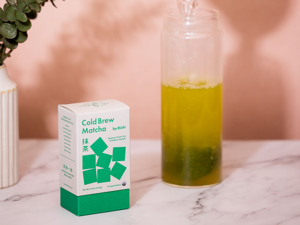 1: Place 1 Cold Brew Matcha Sachet into a tall glass pitcher, like Rishi's 1000ml Simple Brew