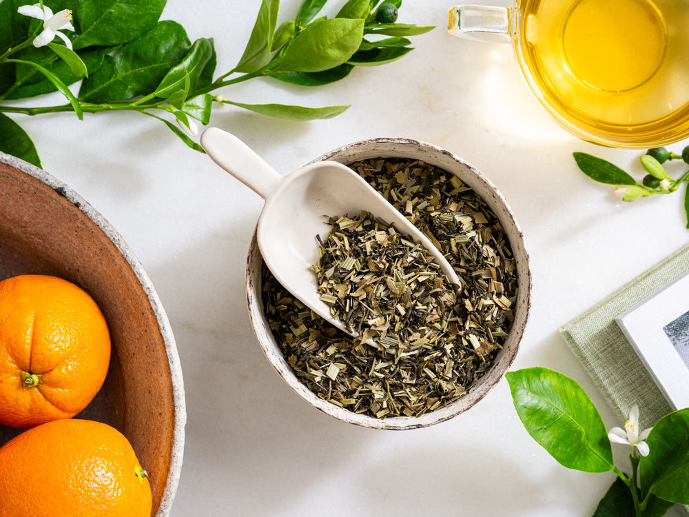 Orange Blossom features fragrant jasmine green tea blended with citrusy herbs like lemongrass and lemon myrtle. The essence of orange, lime and tangerine add zesty brightness, with subtle hints of rose lending high floral notes. Altogether, Orange Blossom uplifts the palate with its inviting aroma.