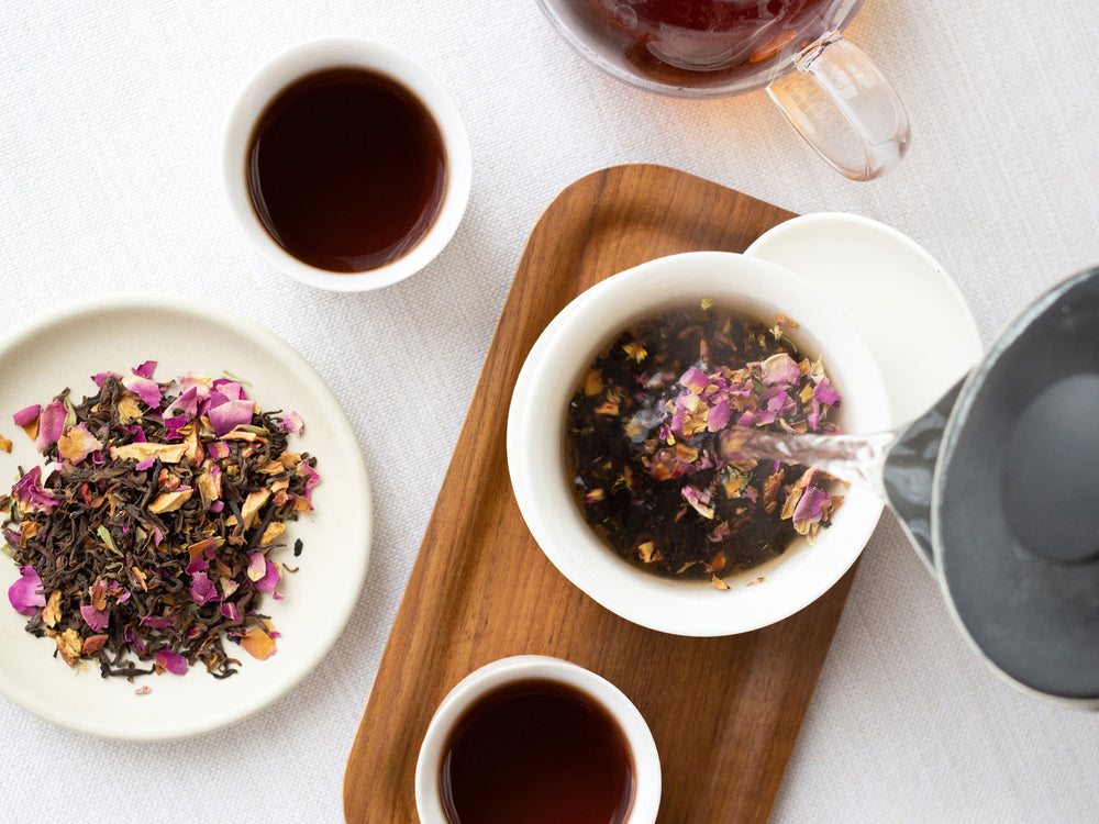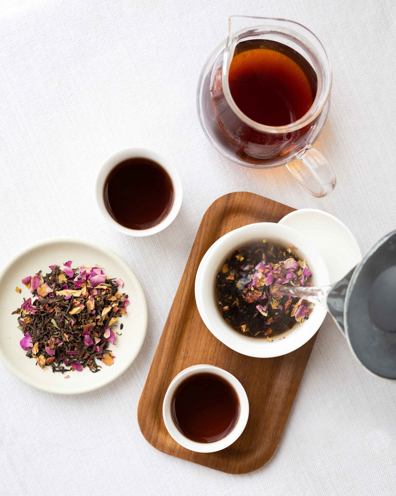 Pu’er tea has a firm and refreshing taste with a digestive and stimulating energy. Pu’er tea is often blended with stimulating spices, citrus peels, aromatic flowers and herbs. Roses and hawthorn fruits are classic and complimentary ingredients blended with Pu’er tea. Hawthorn fruits are a traditional sweet and sour snack in Hong Kong where they are considered to be good for digestion and reducing the effects of oily foods. We combine tangy hawthorn fruits and fragrant red roses from Yunnan with our 5-year aged Shu Pu’er. This blend has a refined and deeply infused red rose aroma with sweet and satisfyingly sour flavors of hawthorn fruits that are well balanced with the deep taste of our organic Shu Pu’er Tea. This tea is great with all types of foods.