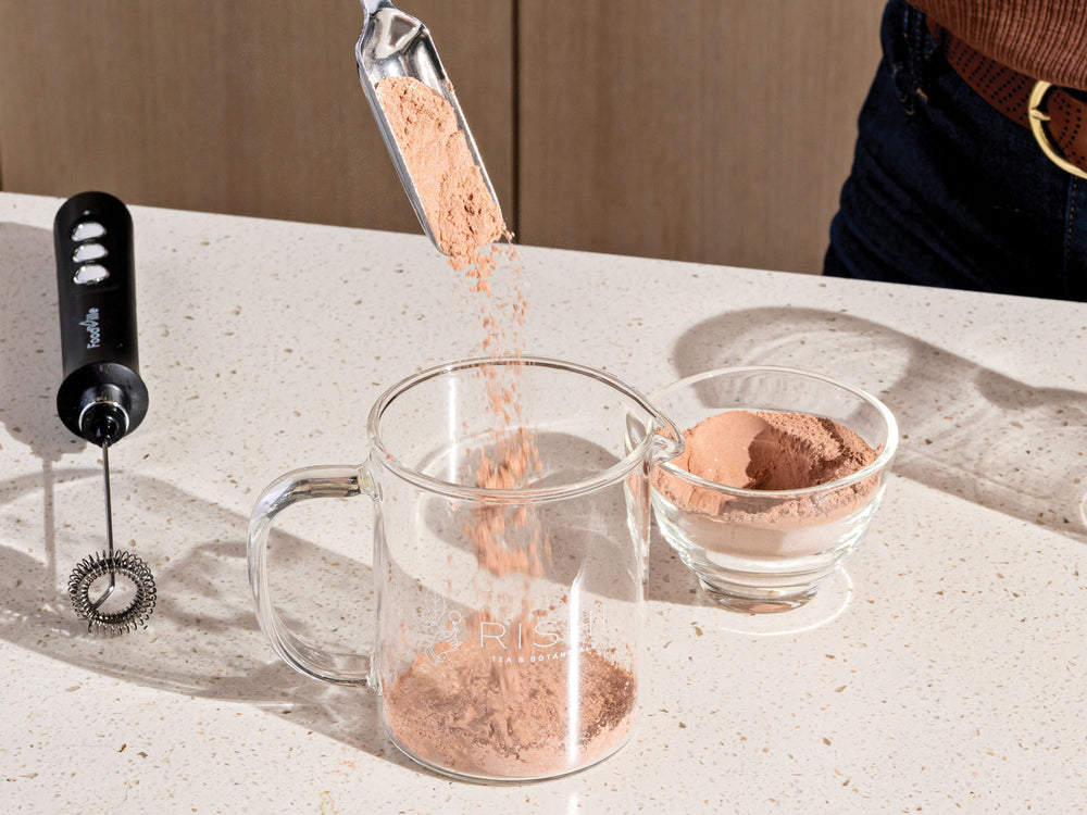 - Add 2 tablespoons (12g) tea powder to a glass mug or Simple Brew Teapot